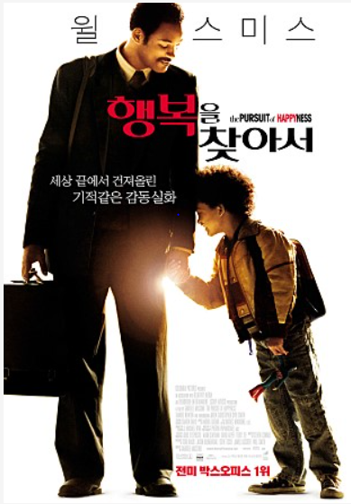 영화 <행복을 찾아서>는 제79회 아카데미 시상식 남우주연상 후보작이였으며,  2006년에 개봉한 월 스미스가 주연인 실화를 바탕으로 제작된 영화다. 미국의 전설적인 흑인 기업가 크리스 가드너가 겪은 실제 경험의 내용을 담고 있으며, 아들 역 배우는 실제로 윌 스미스의 아들이 연기했다. 그만큼 보는이로 하여금 희망을 줄 수 있는 영화라는 평이 주를 이루고,  부성애라는 것이 얼마나 대단한지를 명확히 보여준다. 한 예시로 아들은 놀다 지쳐 잠이 들고 크리스는 지하철 역 내 순찰을 도는 역무원이 화장실 문을 못열게 필사적으로 막으며 끝의 끝으로 내몰린 하루짜리 보금자리를 오열하며 사수하는 모습은  아이의 관점에 맞게 놀아주듯 공공시설의 화장실을 원시 동굴로 만들어 안정감을 만든 현명한 아버지의 대처였으며, 본인 의 속은 아프게 찢어지지만 한 아이의 아버지로서 극한에서도 꺼질 수 없는 부성애를 아주 잘 보여준 장면이 아닐까 싶다. 한 아이를 둔 아버지이자, 자기 자신이 힘이 없고 포기해야하나 싶을 때, 이 영화는 선택이 아닌 필수라고 생각하고 행복을 위한 자세에 대해 명확한 메세지를 전달해 주는 영화이다.