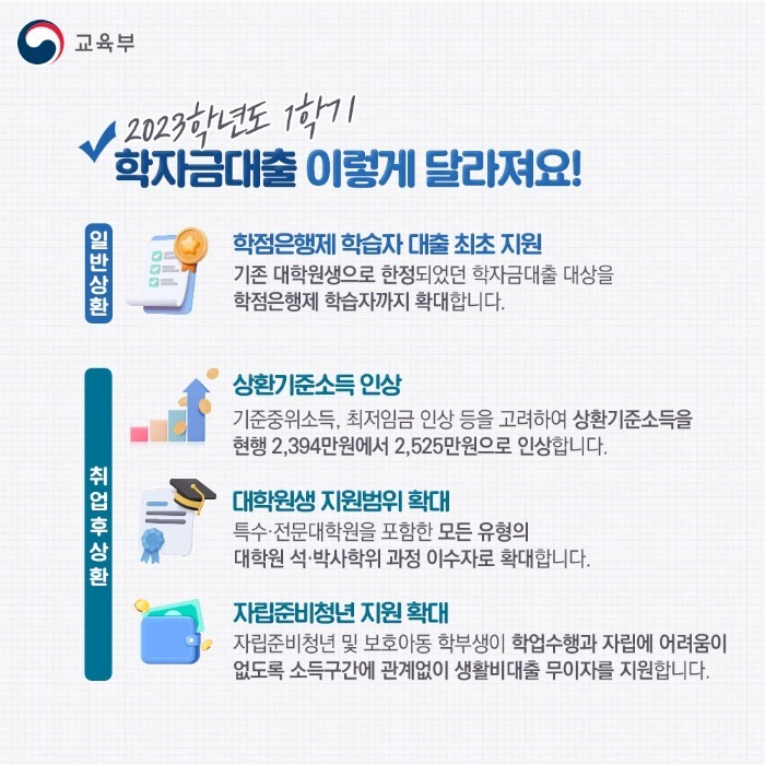 ✓ 학자금 대출금리 1.7% (2022학년도와 동일하게 동결) ✓ 학점은행제 학습자 대출 최초 지원 ✓ 상환기준소득 인상 ✓ 대학원생 지원범위 확대 ✓ 자립준비청년 지원 확대
