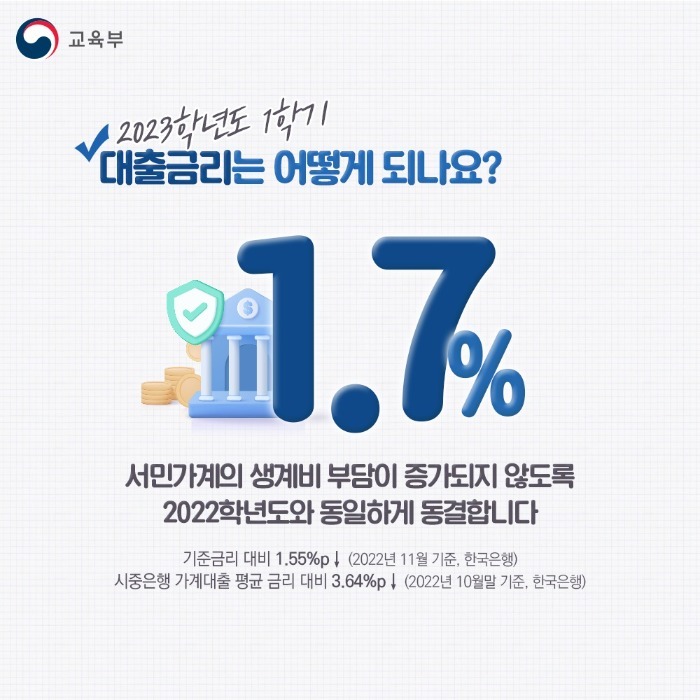 1.7% 서민가계의 생계비 부담이 증가되지 않도록 2022학년도와 동일하게 동결합니다 - 기준금리 대비 1.55%p↓(2022년 11월 기준, 한국은행)